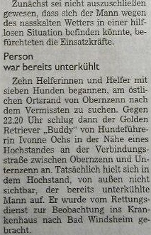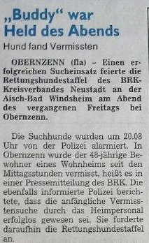 Am 16. Febr. 2013 wurde die Rettungshundestaffel Neustadt/A. gegen 20:08 Uhr zum Einsatz nach Obernzenn gerufen. Ein 49-jähriger Mann wurde seit dem frühen Abend vermisst. Nach genau überlegter Einsatztaktik wurde der Zenngrund von 4 Rettungshundeteams abgesucht. Die Polizei sperrte die Straße, damit die Hunde im Sucheinsatz nicht gefährdet wurden. So arbeiteten sich vom Ortskern Jutta mit Timmy und ich mit Amy und von der östlichen Suchgrenze Stephan mit April und Ivonne mit Buddy durch die Fläche. Wir trafen uns und gingen dann, die Grenzen nach oben versetzt wieder zurück. Dann kam so gegen 22:35 Uhr der Funkspruch von Ivonne, dass sie gefunden hat. Wir waren alle überglücklich. Ivonne erzählte, dass Buddy am Jägerstand seine Anzeige machte. Ihr war es ganz unheimlich, sie rief, keine Antwort, sie rief nochmal, da Buddy ganz sicher seinen Fund weiter verbellte. Schließlich doch eine zögerliche Stimme von oben. Der Mann hatte sich voll in dem Jägerstand verbarrikadiert, jedoch bei den eisigen Temperaturen in der Nacht, hätte er wohl keine Überlebenschance gehabt. Er wurde unterkühlt zur Beobachtung ins Krankenhaus gebracht. Endlich mal ein Einsatz mit Erfolg!! Wie glücklich und froh alle waren. Jeder freute sich, endlich einmal wieder ein Lebendfund! Dann noch das Schicksal, dass Buddy aus dem Zenngrund, einen Menschen in Obernzenn im Zenngrund gefunden hat!!!